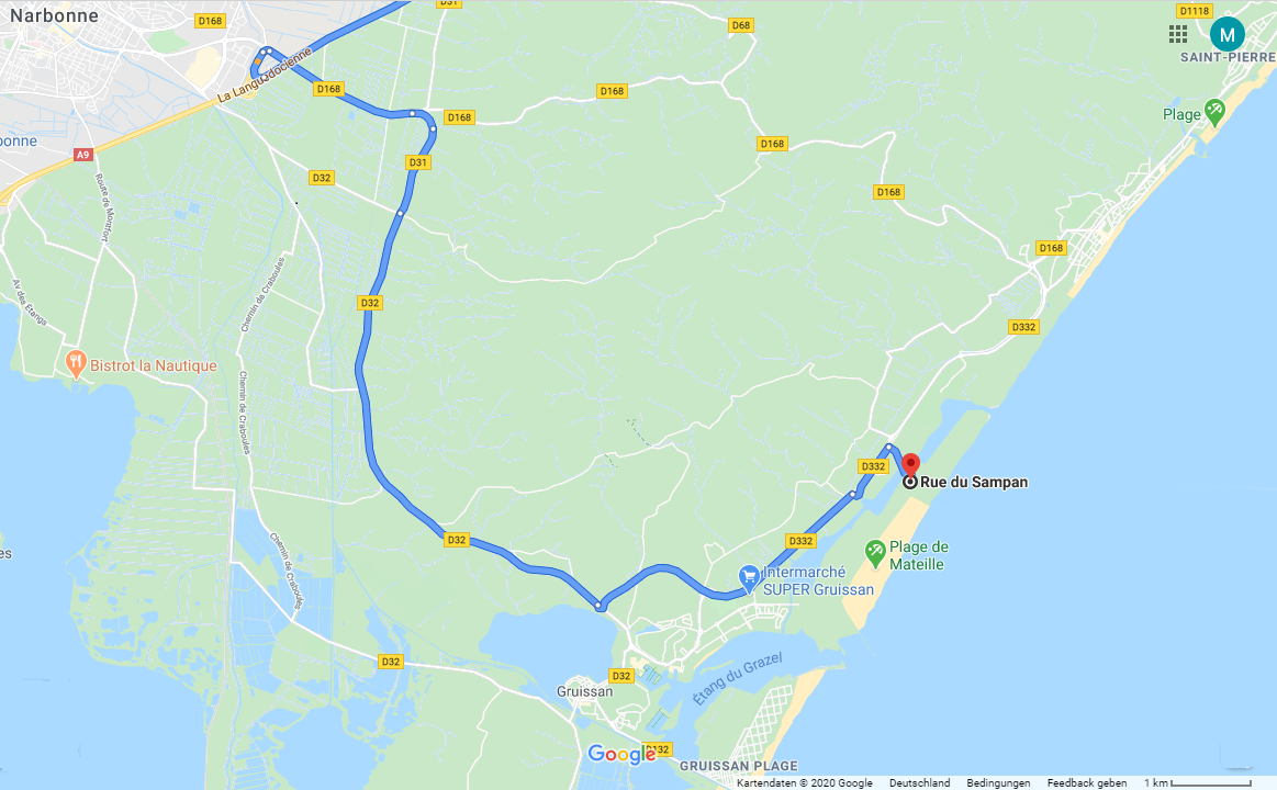 Zug: TGV bis Narbonne / Bus, Taxi oder Mietwagen nach                                                             Gruissan - Les  Ayguades
